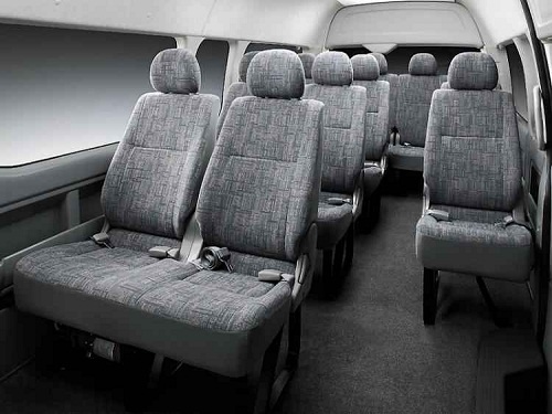 Interior Toyota Hiace memiliki tempat duduk dengan kapasitas penumpang 16 orang dengan rincian 15 di bangku belakang dan 1 di bangku depan. Kenyamanan dan keamanan penumpang di lengkapi dengan pendingin udara.